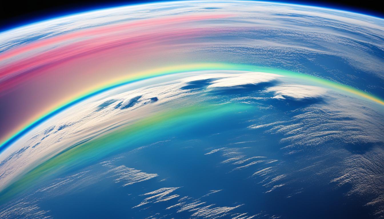 The Earth’s atmosphere is like a canvas for nature’s stunning light shows. Rainbows are a prime example, a colorful arc that has amazed people for ages. They show how light and the atmosphere work together in amazing ways.